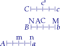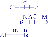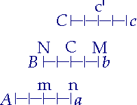 Wenn auf einem bestimmten Raum, z. B. einer Tafel (Aa), zwei mit dieser und untereinander gleich lange Körper, der eine (Bb) mit einem seiner Enden (B) auf der Mitte (m) der Tafel liegt, der andere (Cc) in derselben Richtung nur das Ende (n) der Tafel berührt, und sie sich in entgegengesetzter Richtung bewegen und jener (Bb) z. B. in einer Stunde das Ende (n) der Tafel erreicht, so geschieht, daß der eine (Cc) in der Hälfte der Zeit denselben Raum (CN) durchläuft, den (mn) der andere in der doppelten; die Hälfte ist also dem Doppelten gleich. Nämlich "dieser zweite (c') kommt an dem ganzen ersten (Bb) vorbei". In der ersten halben Stunde läuft c' von M bis C: