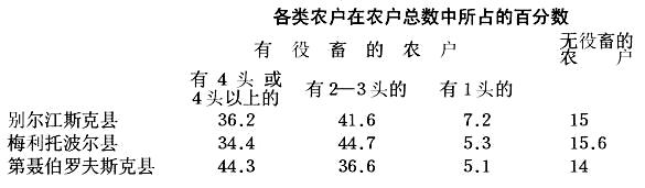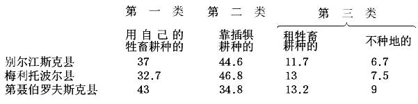 我们考察了农民占有土地和使用土地的情况,现在来谈谈役畜和农具的分配情况。关于各类农民的役畜数量,波斯特尼柯夫提供了如下的三县合计的数字: