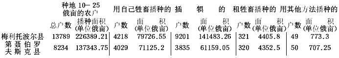 | 农户类型 | 别尔江斯克县 | 梅利托波尔县 | 第聂伯罗夫斯克县 | 所有三县每户平均播种面积 |