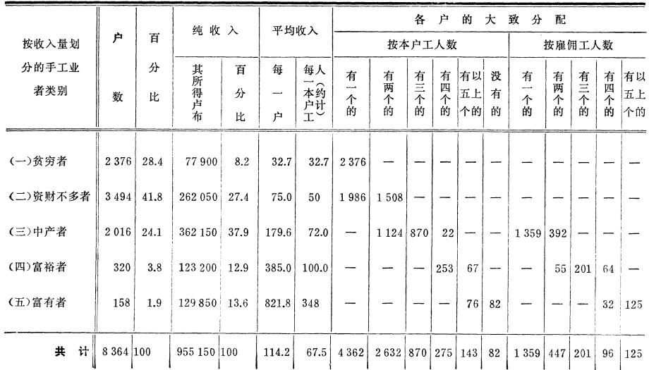 值得注意的是,在雇佣劳动的使用方面,部类间的差别小于一个部类中各分类间的差别。换言之,工业中的经济构成(手艺人、商品生产者、包买主的工人)对雇佣劳动使用程度的影响,要比与农业有无联系方面的影响大得多。例如,种地的小商品生产者同不种地的小商品生产者比较接近,而同种地的手艺人则没有那样接近。第1分类中雇佣工人的百分比,在第Ⅰ部类中为29.4%,在第Ⅱ部类中为31.2%,而在第Ⅰ部类的第2分类中只占14.1%。同样,为包买主工作的耕作者同为包买主工作的非耕作者比较接近(他们的雇佣工人分别为23.2%和27.4%),而同种地的手艺人则没有那样接近。这告诉我们,资本主义商品关系在我国的普遍统治,竟使参加工业的耕作者和非耕作者之间变成没有什么差别了。关于手工业者收入的材料更突出地说明了这一情况。如上所述,第2分类是例外;但如果我们不用雇佣工人百分比的材料,而拿每个作坊的雇佣工人平均数的材料来看,那就能看到,种地的手艺人同不种地的手艺人比较接近(每一作坊的雇佣工人数分别为0.23和0.43),而同其他分类的耕作者则没有那样接近。两个部类中平均每一作坊的手艺人数,几乎是相等的(每个作坊的人数分别为1.7和1.8人),然而每一部类的各分类间的平均人数,差异就非常大了(第Ⅰ部类是2.6和1.7;第Ⅱ部类是2.5和1.8)。