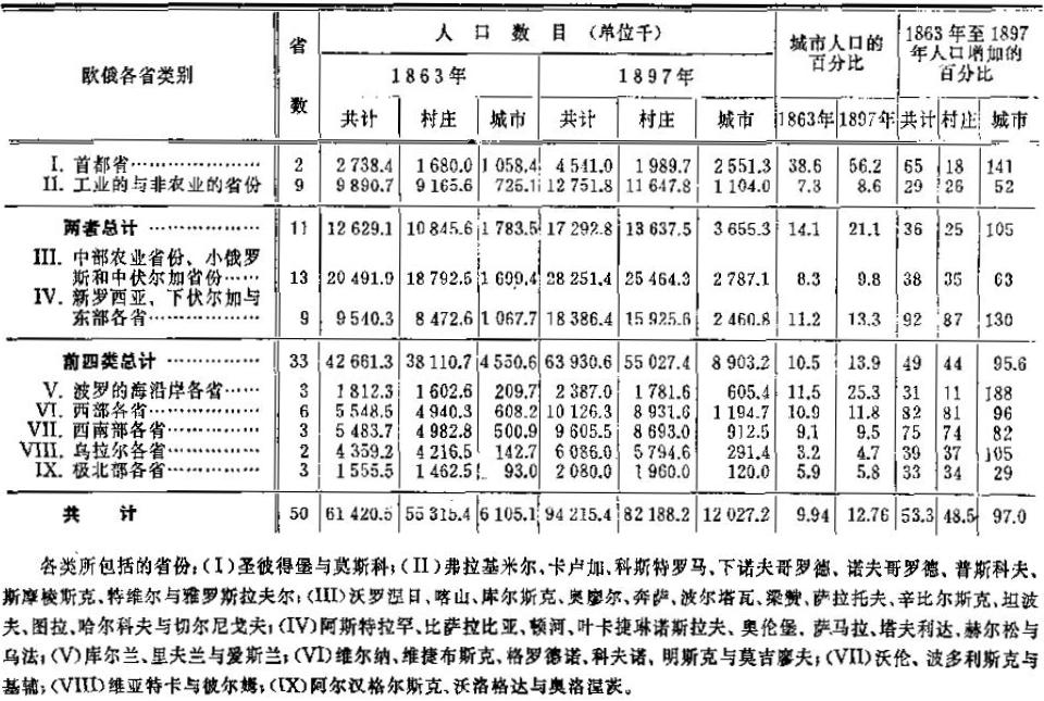 改革后的俄国向我们展现的,正是这两种过程的同时出现。在改革后时代初期,即在60年代,欧俄南部与东部边疆地区是人烟相当稀少的地区,因而俄国中部农业区域的人口就象巨流般地向这里移来。新的土地上新的农业人口的形成,在某种程度内也掩盖了与之平行进行的人口由农业向工业的转移。为了根据城市人口的资料来清楚地说明俄国的这种特点,必须把欧俄的50个省分成几个类别。我们举出1863年和1897年欧俄9个地区的城市人口的资料。FN2
