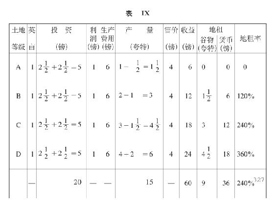 表X中的总收益、货币地租和地租率,也和表II,表VII,表VIII中的相同,因为产量和售价又按相反的比例变动,而投资不变。