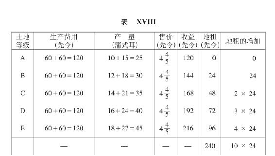 变例3:生产率提高(表XVIII)。在这里A级土地仍起调节作用。