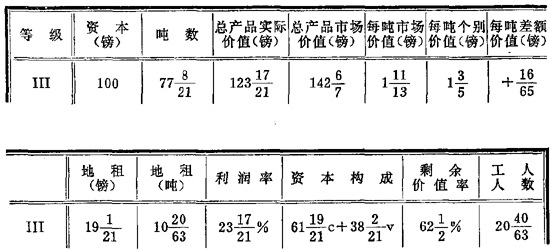 等级Ⅱ的13+(1/3)个工人提供多少吨呢?这里20个工人提供65吨,因而13+(1/3)个工人提供43+(1/3)吨。产品的价值和前面一样,等于100镑。但是这43+(1/3)吨中有33+(1/3)吨必须用于补偿资本。剩下作为剩余产品或地租的是43+(1/3)-[33+(1/3)]=10吨。