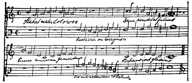 伴奏曲尚未写成,我以后可能还要做些改动。一看便知,除第四行以外,大部分都抄自赞美诗集。歌词是著名的拉丁文赞美诗:“Stabat mater dolorosa Juxta crucem lacrymosa Dum pendebat filius”FN1