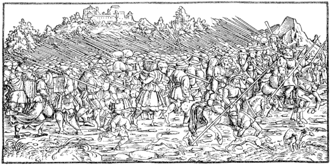 The Allgaeu peasants had, after the departure of Truchsess, renewed their campaign against the monasteries and castles and were using repressive measures in retaliation for the devastations caused by the Union army. They were confronted by few troops which braved only insignificant skirmishes, not being able to follow them into the woods. In June, a movement against the honourables started in Memmingen which had hitherto remained more or less neutral, and only the accidental nearness of some Union troops which came in time to the rescue of the nobility, made its suppression possible. Schapelar, the preacher and leader of the plebeian movement, fled to St. Gallen. The peasants appeared before the city and were about to start firing to break a gap, when they learned of the approach of Truchsess on his way from Wuerzburg. On June 27 they started against him, in two columns, over Babenhausen and Oberguenzburg. Archduke Ferdinand again attempted to win over the peasants to the House of Austria. Citing the armistice concluded with the peasants, he demanded of Truchsess to march no further against them. The Suabian Union, however, ordered Truchsess to attack them, but to refrain from pillaging and burning. Truchsess, however, was too clever to relinquish his primary and most effective means of battle, even were he in a position to keep in order the Lansquenets whom he had led between Lake Constance and the Main from one excess to another. The peasants took a stand behind the Iller and the Luibas, about 23,000 in number. Truchsess opposed them with 11,000. The positions of both armies were formidable. The cavalry could not operate on the territory that lay ahead, and if the Truchsess Lansquenets were superior to the peasants in organisation, military resources and discipline, the Allgaeu peasants counted in their ranks a host of former soldiers and experienced commanders and possessed numerous well-manned cannon. On July 19, the armies of the Suabian Union opened a cannonade which was continued on every side on the 20th, but without result. On July 21, Georg von Frundsberg joined Truchsess with 300 Lansquenets. He knew many of the peasant commanders who had served under him in the Italian military expeditions and he entered into negotiations with them. Where military resources were insufficient, treason succeeded. Walter Bach and several other commanders and artillerymen sold themselves. They set fire to the powder store of the peasants and persuaded the troops to make an enveloping movement, but as soon as the peasants left their strong position they fell into the ambush placed by Truchsess in collusion with Bach and the other traitors. They were less capable of defending themselves since their traitorous commanders had left them under the pretext of reconnoitering and were already on their way to Switzerland. Thus two of the peasant camps were entirely disrupted. The third, under Knopf of Luibas, was still in a position to withdraw in order. It again took its position on the mountain of Kollen near Kampten, where it was surrounded by Truchsess. The latter did not dare to attack these peasants, but he cut them off from all supplies, and tried to demoralise them by burning about 200 villages in the vicinity. Hunger, and the sight of their burning homes, finally brought the peasants to surrender (July 25). More than twenty were immediately executed. Knopf of Luibas, the only leader of this troop who did not betray his banner, fled to Biegenz. There he was captured, however, and hanged, after a long imprisonment.